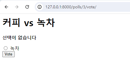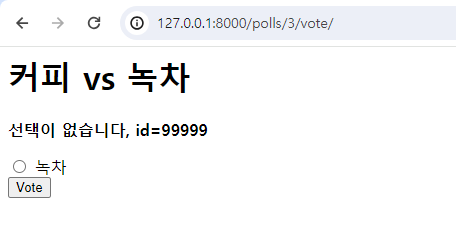 우리가 커피를 선택하고 제출하는 그 사이에 커피 choice가 사라졌어도 위와 같이 polls/detail.html 로 가며 그 사이 다시 한번 상세 페이지가 그려졌기 때문에 선택이 없습니다 + 선택지가 녹차만 뜨게 됩니다.