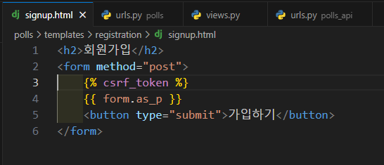 polls(앱)/templates/registration/signup.html과 같은 경로로 템플릿 파일을 만들고