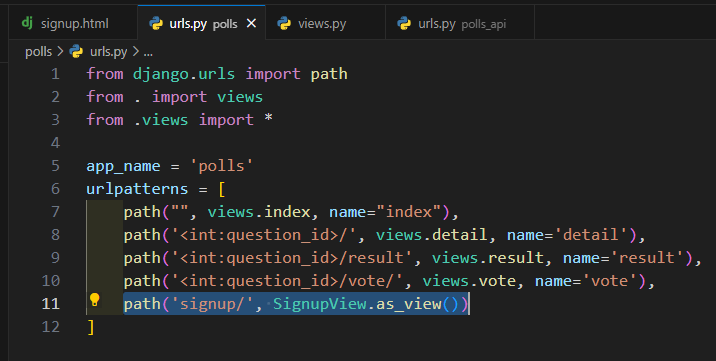 그러면 signup.html로 갈 수 있는 URL을 설정을 해줘야겠군요! 아까 회원 목록을 조회하는 기능이 polls_api/views.py에서 작성되어서 reverse_lazy()의 URL은 polls_api/urls.py에서 설정했지만 이번에는 polls/urls.py에서 진행하겠습니다.