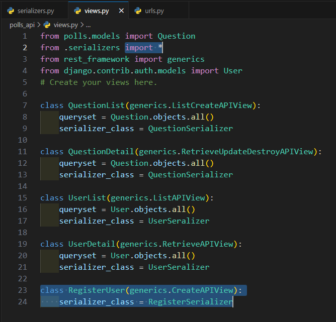 방금 미리 만들어둔 RegisterSerializer를 import해 generics의 도움으로 손쉽게 작성했습니다.