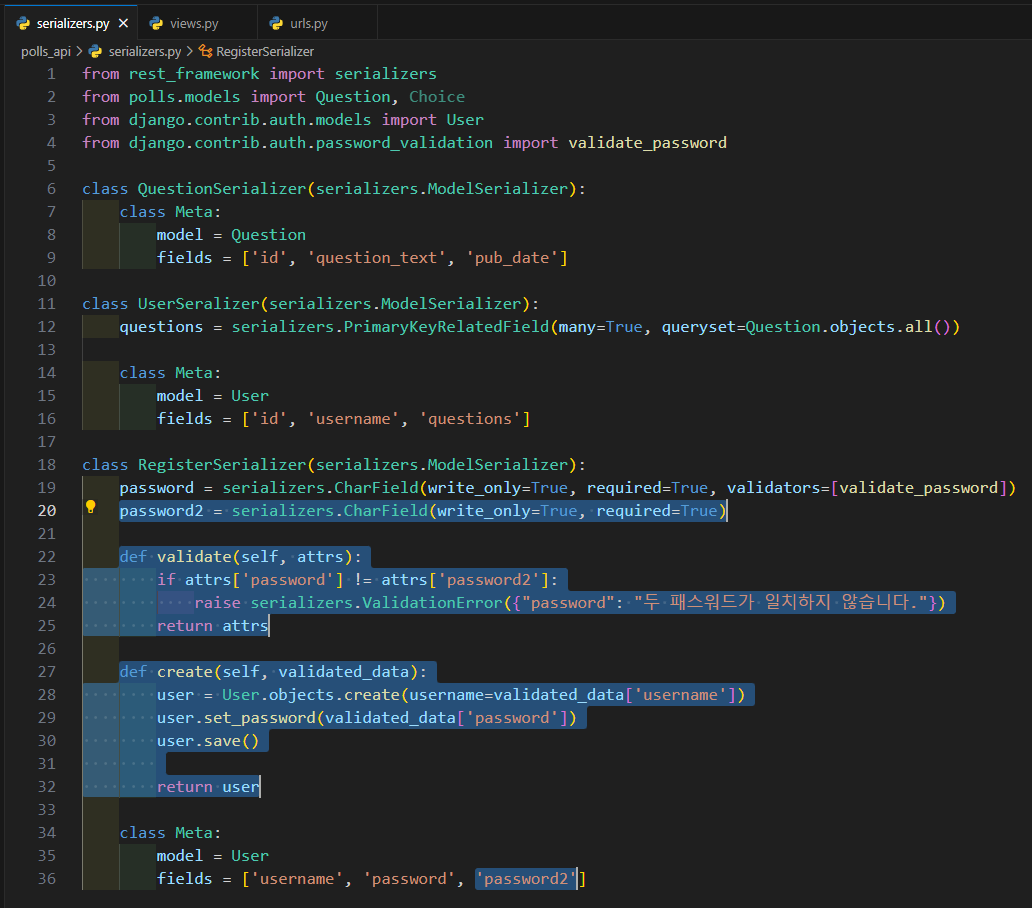 우리는 DRF를 이용한 Serializer는 polls_api/serializers.py에서 구현해왔습니다.